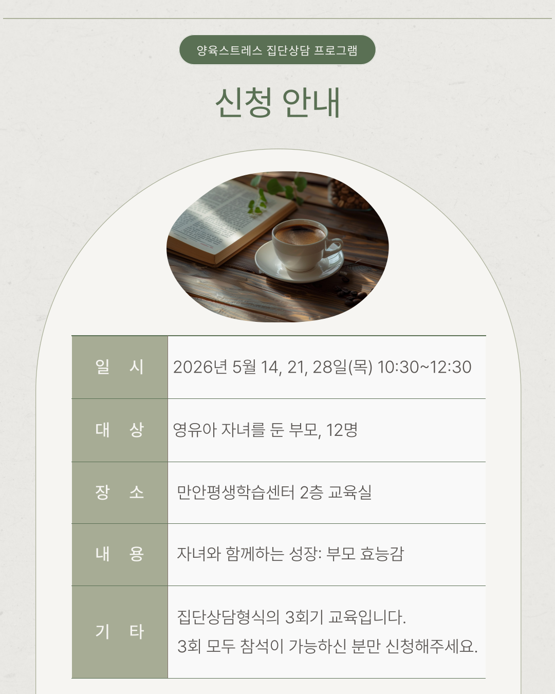 본 교육은 안양시 거주(또는 안양시 소재 직장근로자) 영유아를 양육하는 부모만 신청 가능합니다.