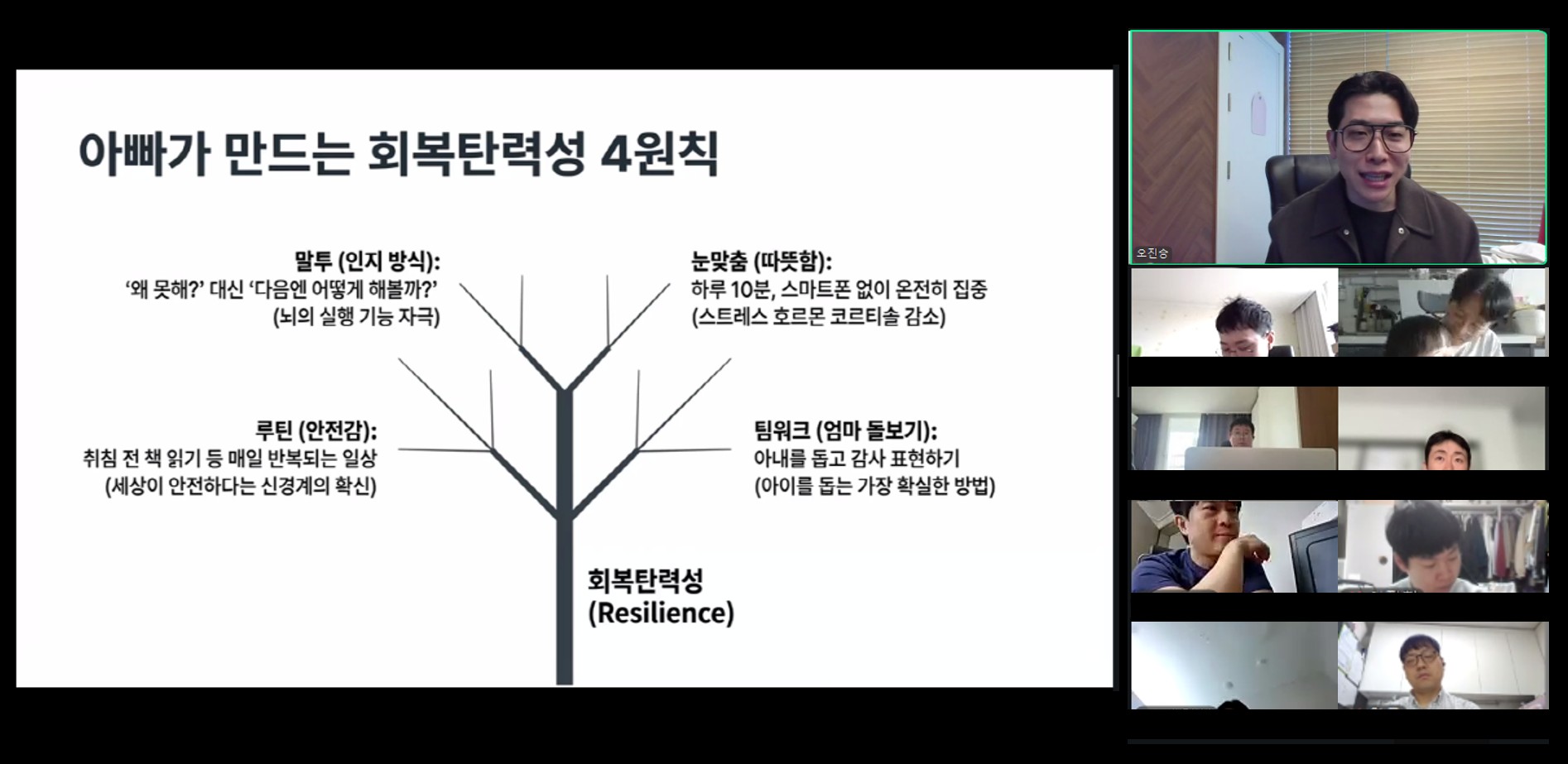 화창한 토요일 아침에도 자녀를 향한 아빠들의 관심과 열정은 뜨거웠습니다. 정신건강의학과전문의 닥터 프렌즈 오진승 강사님의 특강에 많은 아빠들이 참여해 주셨습니다. "'항상 내가 잘 하고 있나' 고민되었는데 '충분히 잘 하고 있다'는 자신감을 받았습니다." "주말에는 육아와 자기개발에 시간이 없었는데 이렇게 저도 챙기며 육아하면서 줌으로 집에서 좋은 강의 들을 수 있어서 좋았습니다. 감사합니다!" 등 아빠 육아에 대한 고민이 해소되고, 지금도 잘하고 있고 앞으로도 잘 할 수 있다는 자신감을 가지는 의미있는 시간이었다는 의견을 남겨주셨습니다. 비슷한 연령대의 자녀를 양육하는 아빠로서의 강사님의 공감과 응원도 큰 힘이 되셨을거라 생각합니다. 안양시육아종합지원센터에서는 슬기로운 아빠육아학교로 아빠 육아를 다양한 방법으로 응원하고 있습니다. 지속적인 관심과 참여를 부탁드립니다.