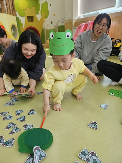 개구리가 되어 파리를 잡아보는 활동을 하였습니다. 바닥에 놓인 파리를 향해 힘껏 파리채를 내리치며 집중하는 우리 친구들!! "나 이만큼 잡았어!"하며 엄마에게 잡은 파리도 보여주고, 직접 잡은 파리도 세어보기도 했습니다. 또 벨크로에 붙어 있는 파리를 하나씩 떼어보며 뿌듯함을 느끼는 모습이 인상적이었습니다. 활동 내내 꺄르르~ 아이들의 웃음이 끊이지 않았던 시간이었습니다. 4월은 봄을 주제로 어울누리 활동을 진행했는데요, 다가오는 5월에는 또 어떤 활동이 기다리고 있을지... 기대되시죠!! 앞으로도 아이들과 함께하는 소중한 시간, 계속해서 이어가겠습니다.