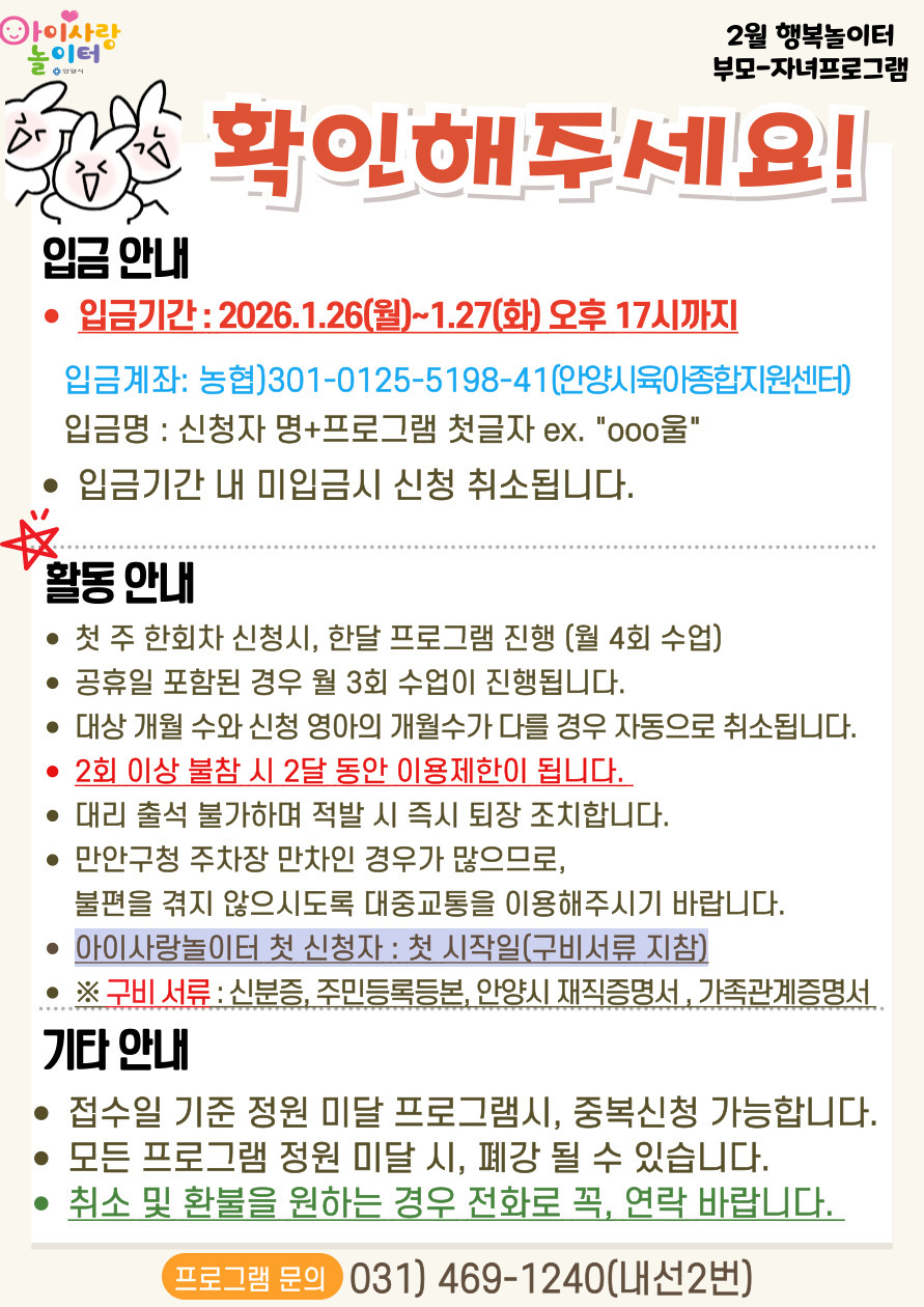 - 아이사랑놀이터 첫방문 신청자분은 프로그램 첫 시작일, 구비서류(신분증, 등본)을 안내데스크에 보여주시기 바랍니다.