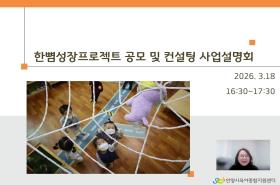 3월 18일(수) 한뼘성장프로젝트 사업 설명회가 진행되었습니다. 본 사업은 보육현장에 영유아 . 놀이중심으로 개정된 표준보육과정(누리과정)의 안정적인 안착을 지원하는 사업으로 관내 어린이집 27개소에서 관심을 갖고 ..