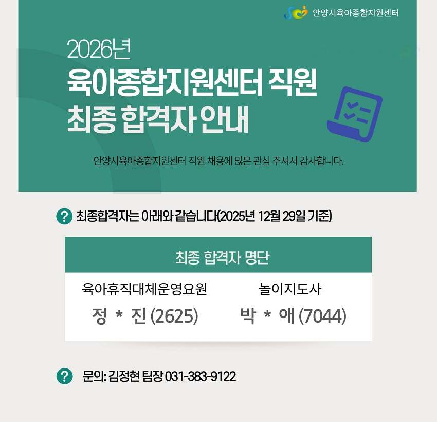 [센터] 2026년 안양시육아종합지원센터 직원 최종 합격자 명단