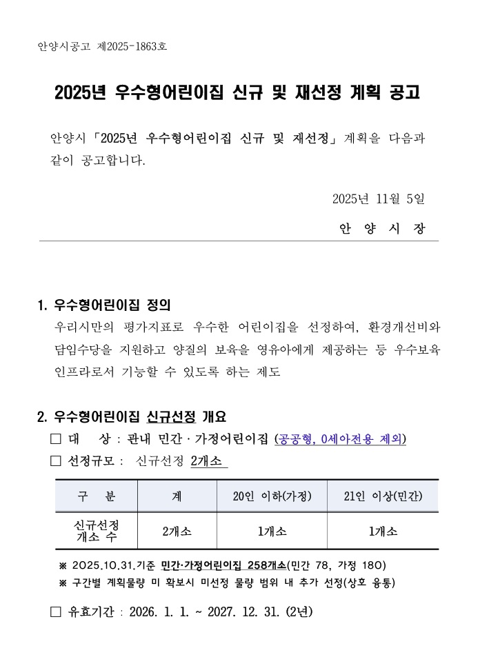[시정소식] 2025 안양시 우수형어린이집 신규, 재선정 계획 공고문
