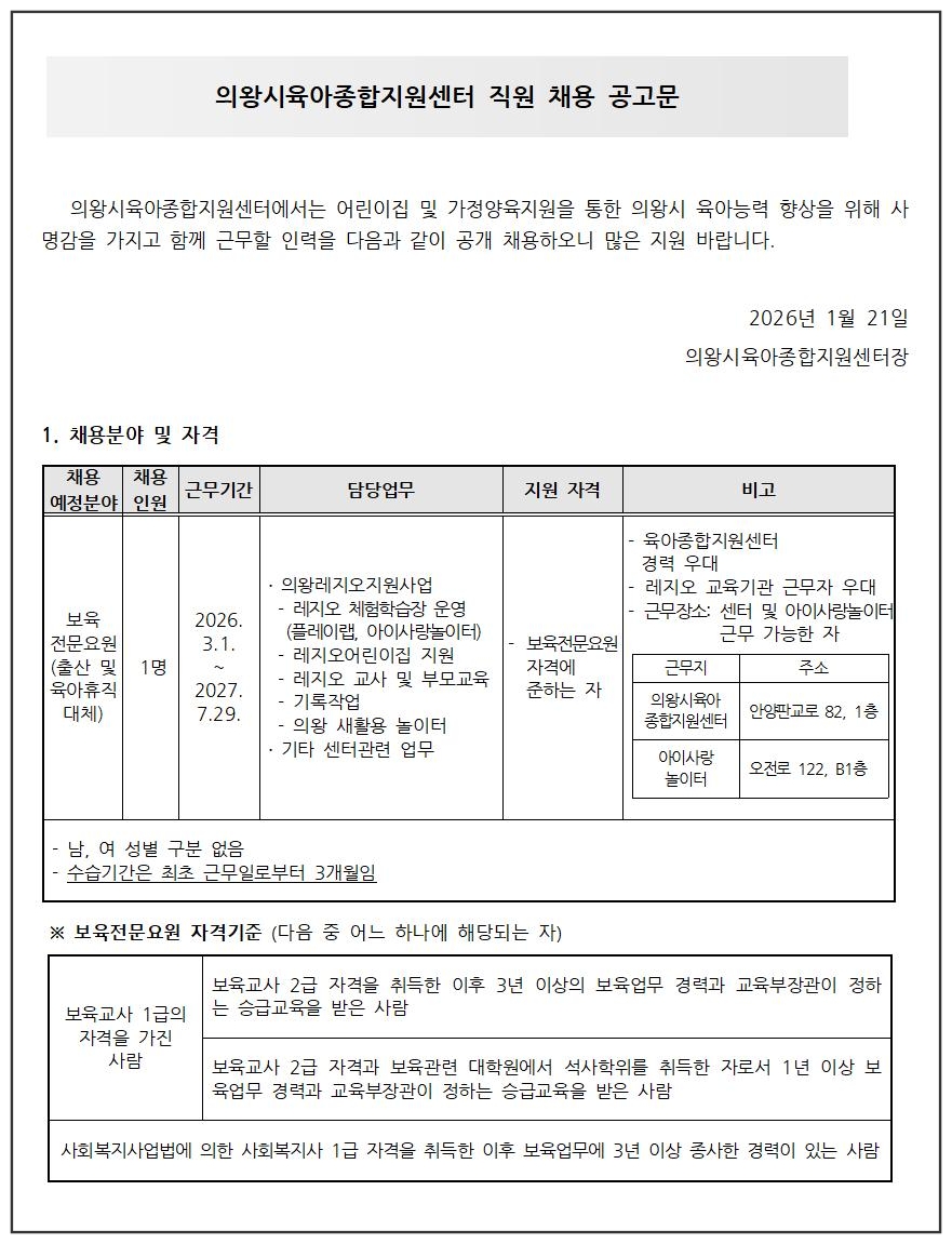 [채용공고] 의왕시육아종합지원센터 직원 채용 공고