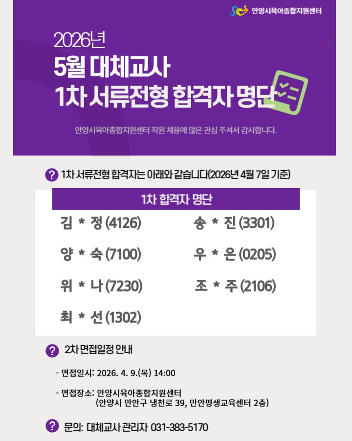[채용공고] 2026년 5월 교육부 대체교사 1차 서류전형 합격자 안내