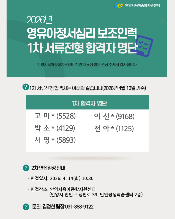[채용공고] 영유아정서심리보조인력 1차 서류전형 합격자 안내