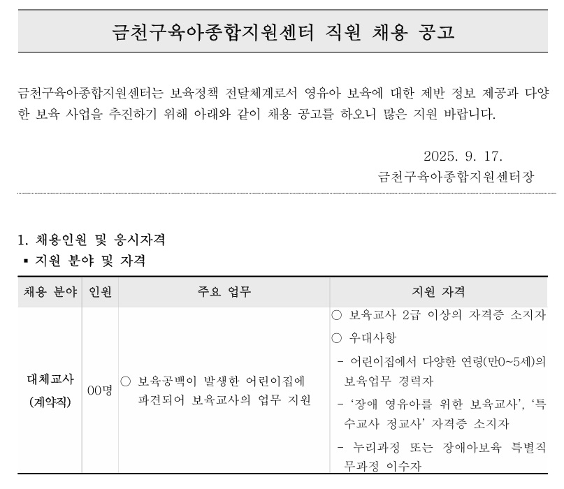 금천구육아종합지원센터 직원(대체교사) 채용공고
